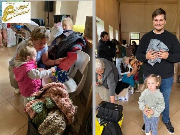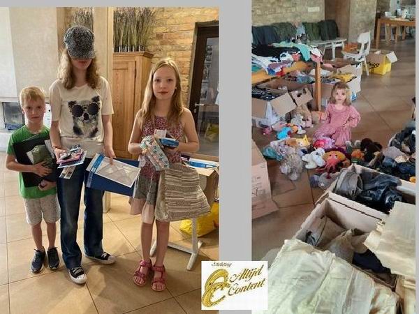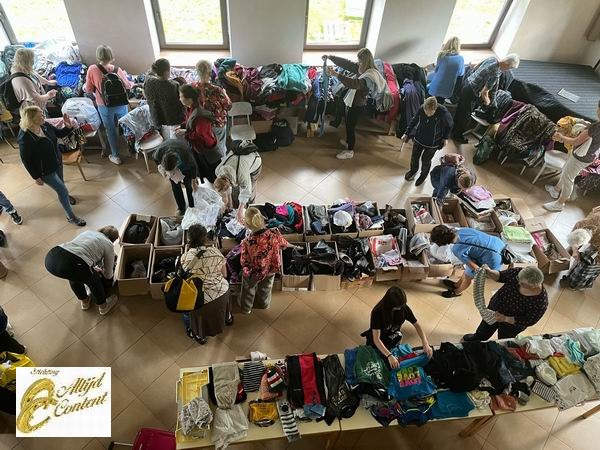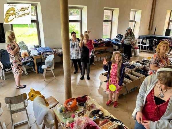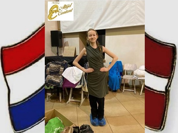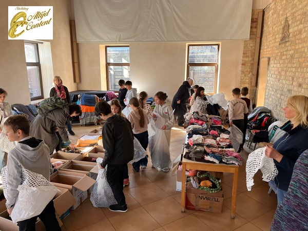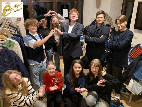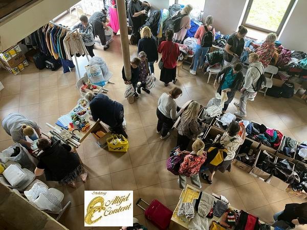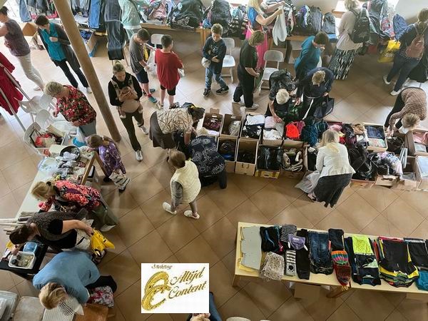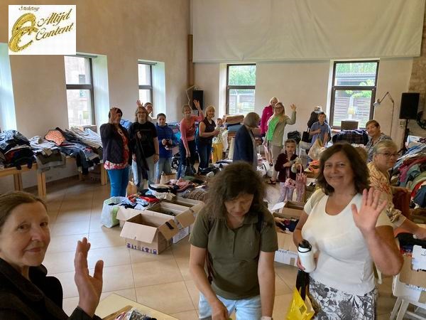Scholieren van het Gymnasium hebben deze keer goed geholpen om alles op tijd uitgestald te krijgen. Op een van de foto’s zijn ze ook te zien, keurig netjes in pak en hun handen maken het gebaar van een hartje en bedankje. Er kwamen veel moeders die blij waren om kleding voor zichzelf maar vooral voor hun kinderen mee naar huis te kunnen nemen.