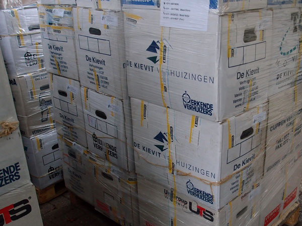Om de goederen te vervoeren hebben we deze keer gelukkig gebruik kunnen maken van de pallets van de Crooijmans dakbedekking uit Deurne en de verhuisdozen van de Kievit verhuizingen uit Venlo.