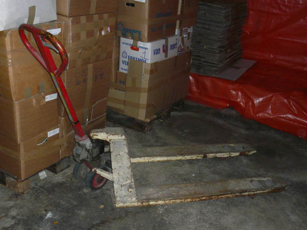 Vanmorgen om 12:00 uur hebben we bij de firma TopTen de door de heer Smit van de Lions Club Woerden toegezegde palletwagen opgehaald. De heer Smit had gezegd, dat deze wagen nog ergens in de loods moest staan. En inderdaad de palletwagen stond in de loods achter een stapel pallets.
