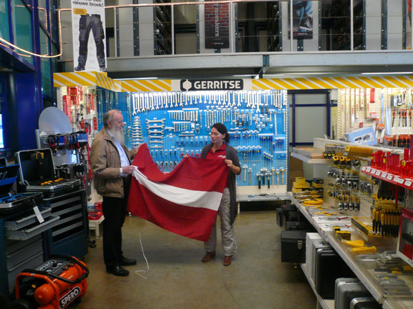 Vanmorgen hebben wij bij de firma Gerritse in Woerden 2 dozen Gerritse plakband opgehaald. Zoals afgesproken tijdens de beursvloer is er een originele Letse vlag aan mevrouw Wagemaker overhandigd.